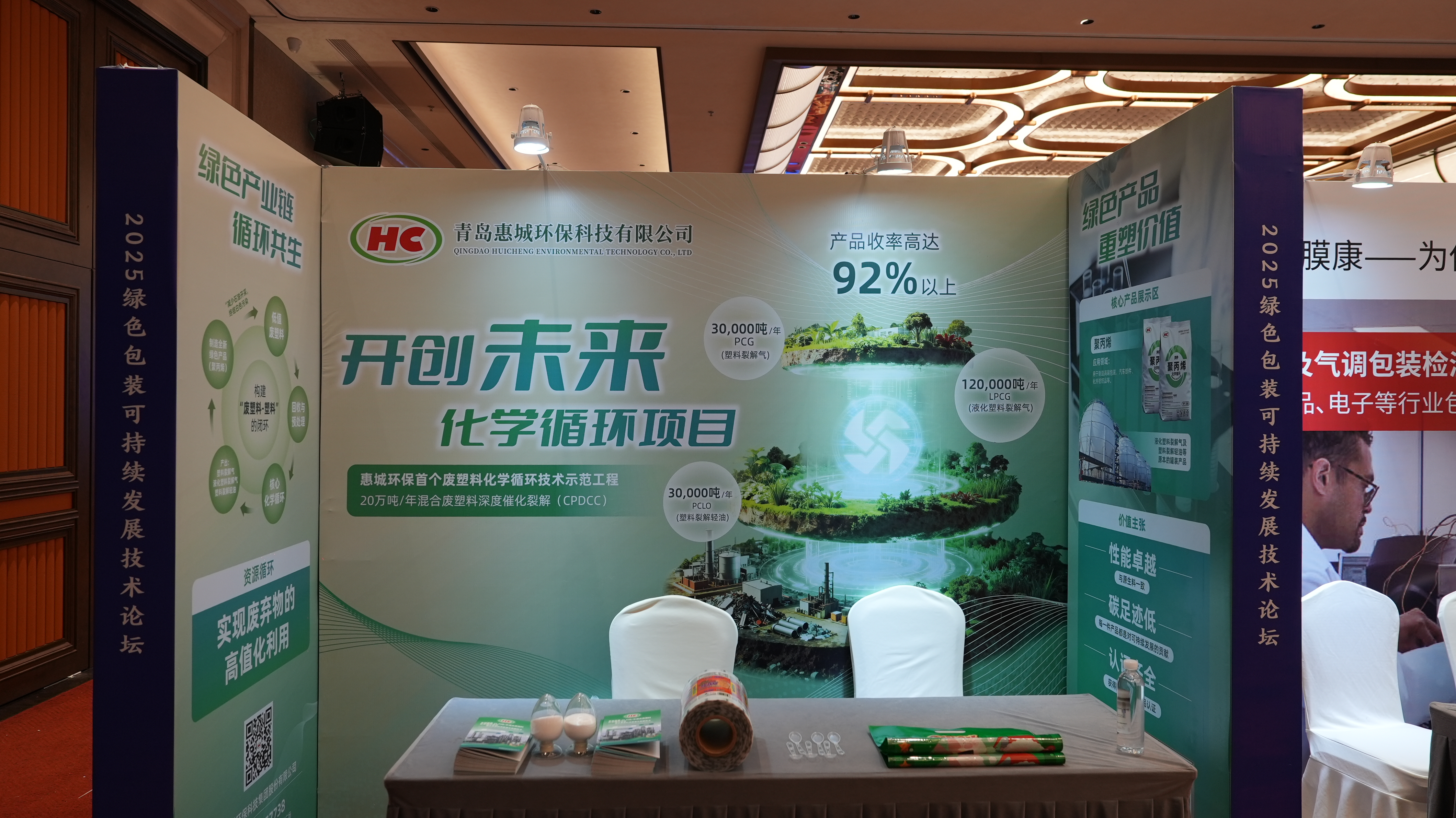为促进技术与市场的精准对接,论坛现场设置了25个专业展位,集中展示绿色包装领域的最新产品、前沿技术与创新服务。惠城环保展台前人气高涨,现场展示了基于CPDCC技术生产的聚烯烃产品所制成的各类塑料制品,以其优异的性能、环保的理念吸引了众多包装企业代表驻足咨询。参会嘉宾通过近距离观察产品质感、详细了解技术原理,对惠城环保以化学循环方式破解塑料污染难题、拓展包装材料来源的创新路径给予高度认可,不少企业当场表达了进一步合作洽谈的意向。