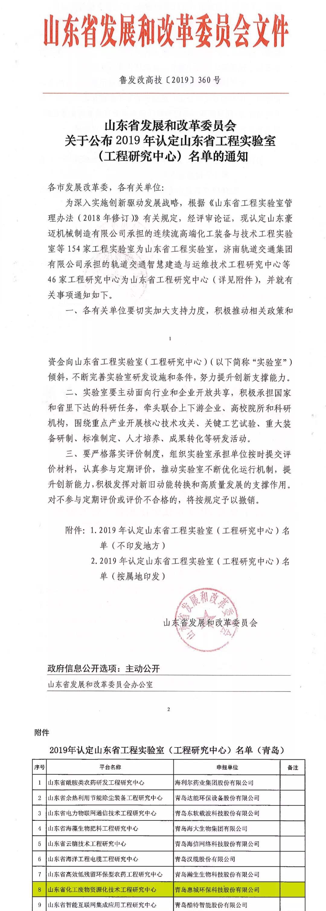 日前,根据山东省发展和改革委《关于公布2019年认定山东省工程实验室(工程研究中心)名单的通知》(鲁发改高技〔2019〕360号)发布文件,我公司申报的省级工程研究中心获批并被认定为山东省化工废物资源化技术工程研究中心。
