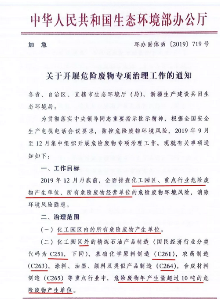 日前生态环境部印发加急文件《关于开展危险废物专项治理工作的通知》。 《通知》要求今年年底前,在全国范围内排查化工园区、重点行业危险废物产生单位、所有危险废物经营单位的危险废物环境风险,消除环境风险隐患。[ 查看更多 ]